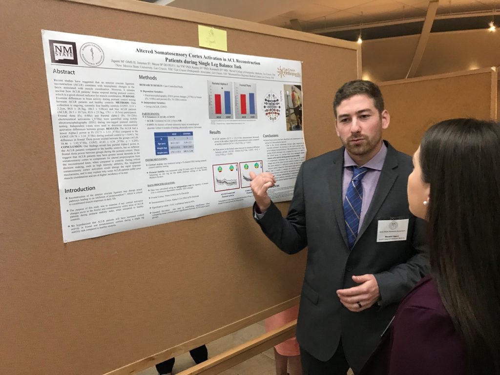 Jiganti said his project was on “cortical brain activity and any changes that may occur in individuals who have had ACL reconstruction surgery. Working with Dr. Yong Woo An from the NMSU Dance and Kinesiology Lab, we measured brain activity of our subjects using an electroencephalography cap while they performed balancing tasks on a specialized balancing machine. I initially heard about the project through a classmate, Temi Ogunleye; so without help from my peers I never would have had this experience. It highlights the importance of a medical school class communicating about the different opportunities that are out there.”