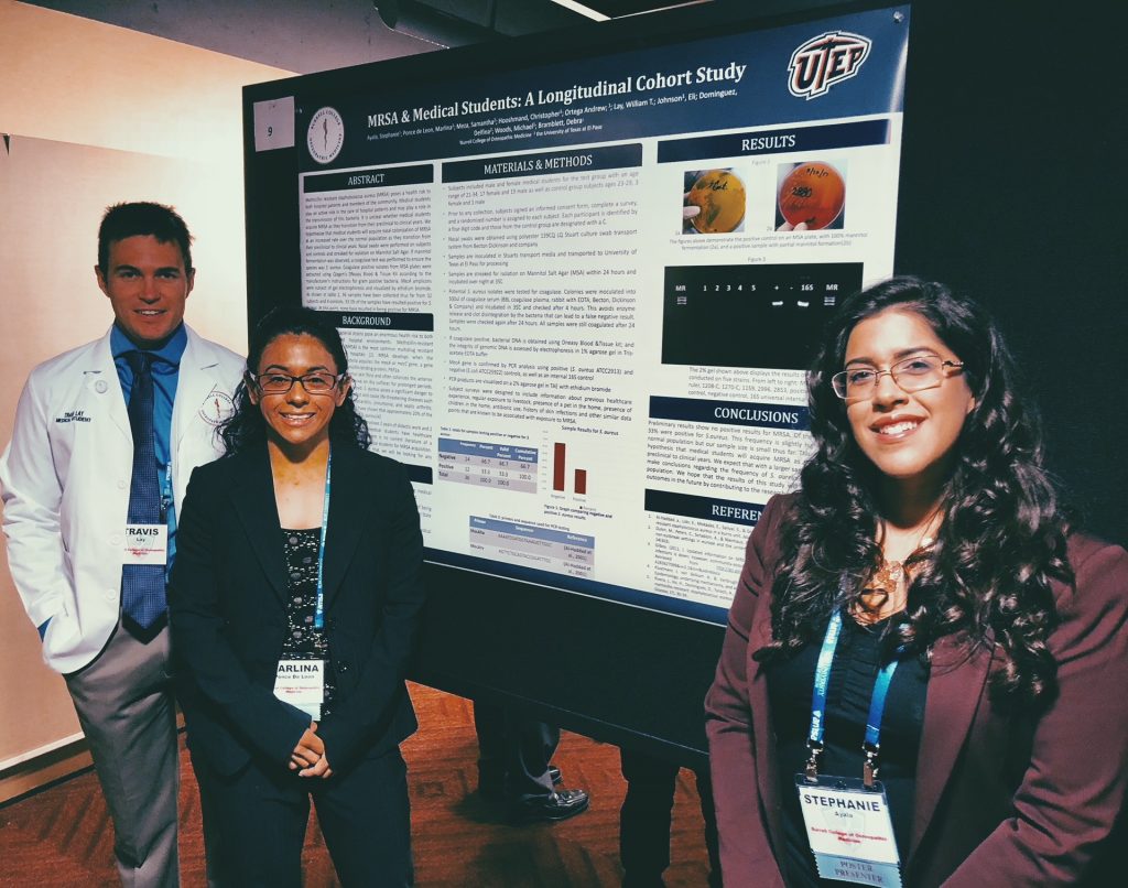 BCOM medical students Stephanie Ayala, Marlina Ponce de Leon, and William Lay presented their research project “MRSA & Medical Students: A Longitudinal Cohort Study” at the American Medical Student Association (AMSA) national convention in Washington DC. Other contributors to the project included BCOM students Christopher Hooshmand, Andrew Ortega, and Eli Johnson; BCOM faculty members Michael Woods, Ph.D. and Debra Bramblett, Ph.D.; UTEP student Samantha Meza; and UTEP bioinformatics professor Delfina Dominguez, Ph.D.