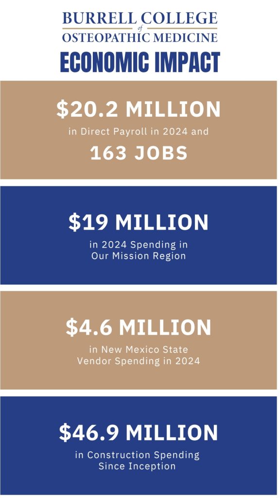 Locally, Burrell College’s impact continues to grow. In 2024, the College generated regional economic activity through $20 million in direct payroll, $19 million in mission region spending and $4.6 million in New Mexico state vendor spending. Since its inception, Burrell College has added $46.9 million in construction spending. These investments create jobs, drive operational growth, strengthen the local health care workforce and support the well-being of families, businesses and communities across the region.