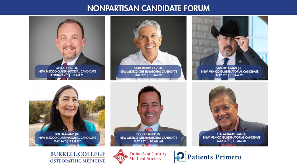 LAS CRUCES, N.M. — The Doña Ana County Medical Society, the Burrell College of Osteopathic Medicine Student Family Medicine Interest Group, and Patients Primero will host a series of nonpartisan public forums featuring candidates for Governor of New Mexico at Burrell College of Osteopathic Medicine, 3501 Arrowhead Drive, Las Cruces, New Mexico.