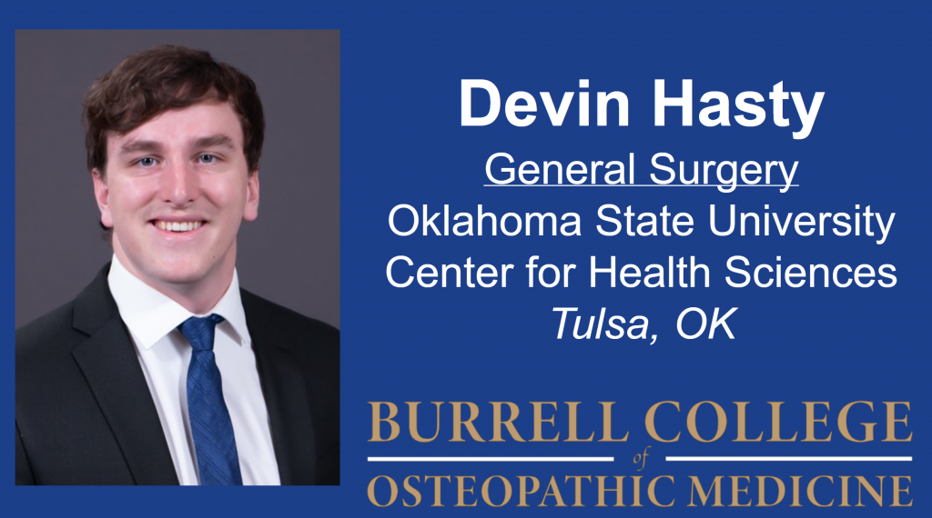 Devin Hasty matched General Surgery at Oklahoma State University Center for Health Sciences in Tulsa, Oklahoma. Hasty’s clinical experiences in underserved regions shaped his perspective on access to care and informed his path forward.