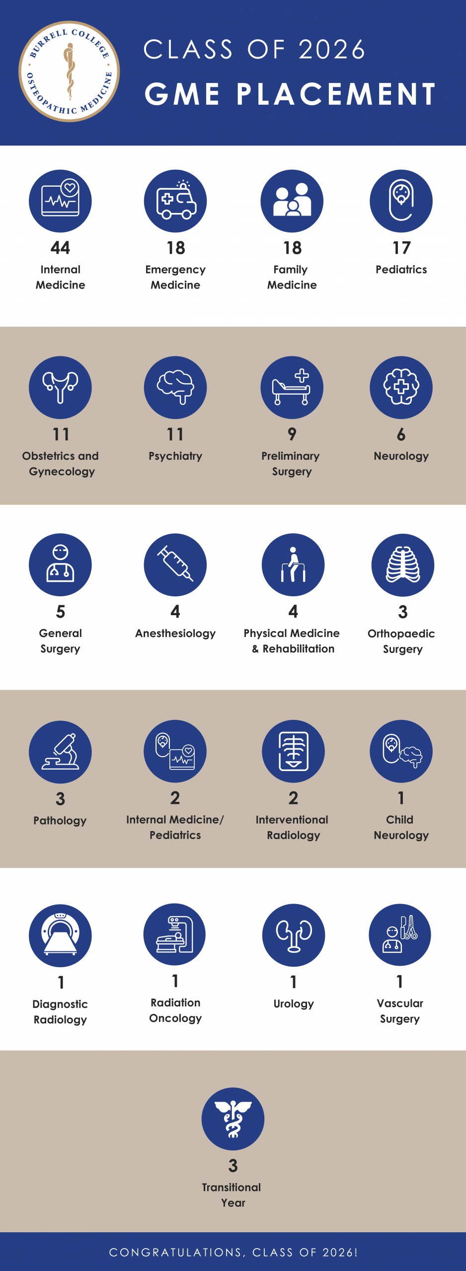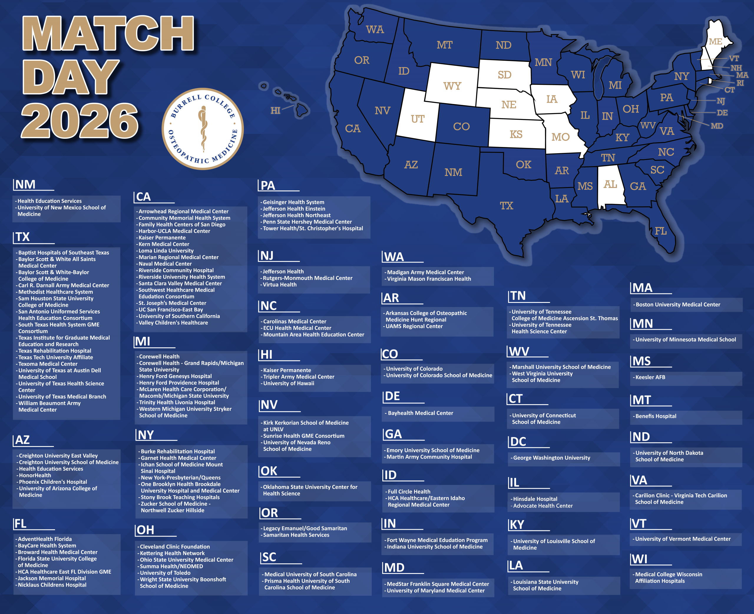 Overall, the Burrell College students matched into 22 disciplines across programs nationwide, including 7 in Las Cruces/El Paso, 4 in Albuquerque, and 9 in Florida.