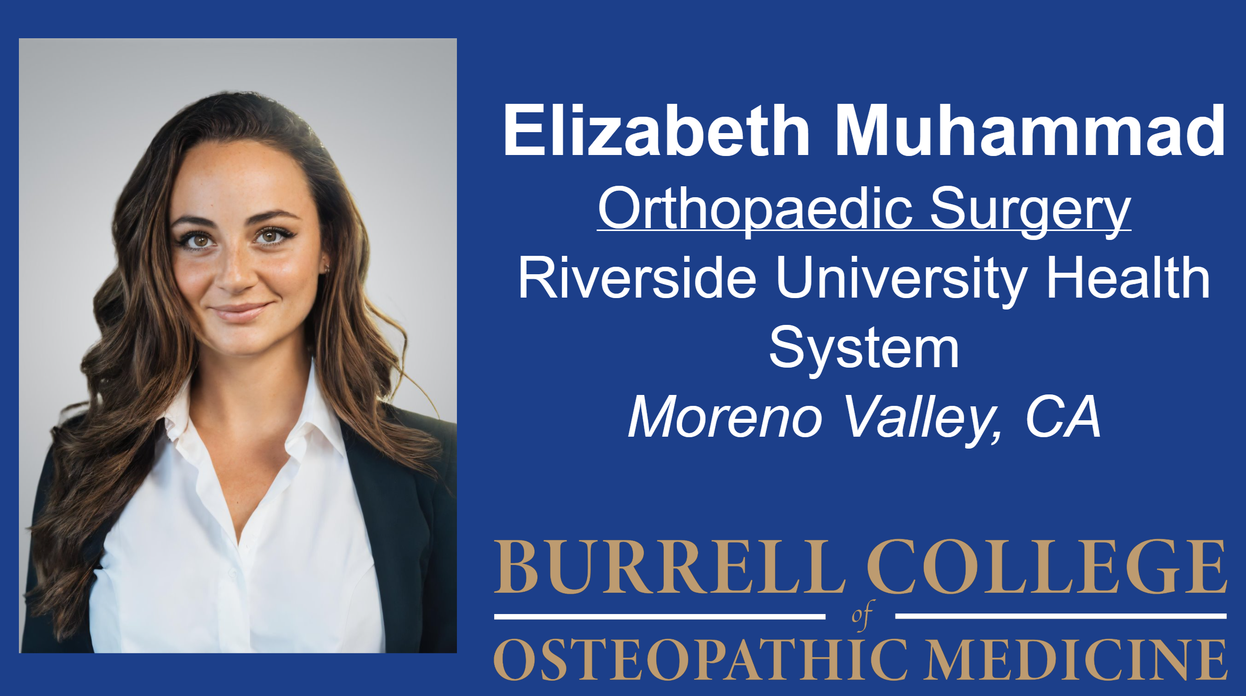 Elizabeth Muhammad matched Orthopedic Surgery at Riverside University Health System, Moreno Valley, California. A dedicated student physician driven by growth and impact, Muhammad is focused on developing her skills and identity in medicine.